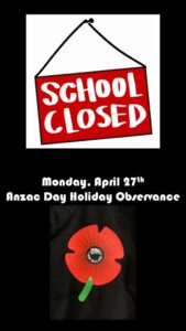 This morning at school prayers, I reminded the children about ANZAC day which is tomorrow; and that they have a three day weekend with the ANZAC public holiday on Monday. I invited them to attend the ANZAC parade with me tomorrow. Details are below in this Principal Message